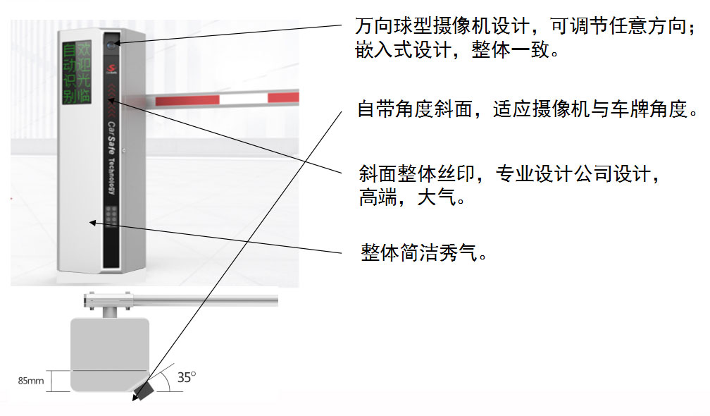 騰龍車牌識別道閘一體機將萬向球型車牌識別攝像機嵌入機身,根據車場使用特點將機箱設計一個識別傾斜面,使攝像機與車牌識別角度達到最優,再輔以流線型圓角設計,同時通過整個色調的搭配,整體外觀渾然天成,簡潔、美觀、精致。